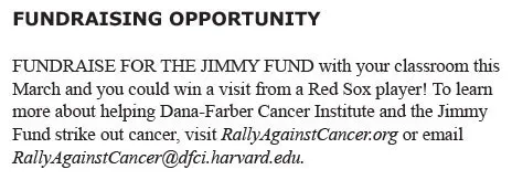 FUNDRAISE FOR THE JIMMY FUND with your classroom this March and you could win a visit from a Red Sox player! To learn more about helping Dana-Farber Cancer Institute and the Jimmy Fund strike out cancer, visit RallyAgainstCancer.org or email [email protected].