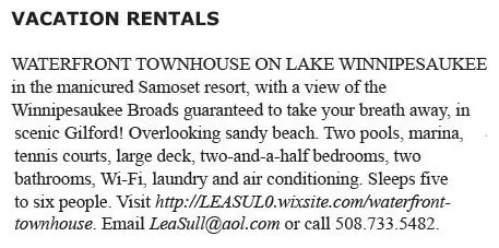 WATERFRONT TOWNHOUSE ON LAKE WINNIPESAUKEE in the manicured Samoset resort, with a view of the Winnipesaukee Broads guaranteed to take your breath away, in scenic Gilford! Overlooking sandy beach. Two pools, marina, tennis courts, large deck, two-and-a-half bedrooms, two bathrooms, Wi-Fi, laundry and air conditioning. Sleeps five to six people. Visit http://LEASUL0.wixsite.com/waterfront-townhouse. Email [email protected] or call 508.733.5482.