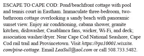 ESCAPE TO CAPE COD: Pond/beachfront cottage with pool and tennis court in Eastham. Immaculate three-bedroom, twobathroom cottage overlooking a sandy beach with panoramic sunset view. Enjoy air conditioning, cabana shower, granite kitchen, dishwasher, Casablanca fans, wicker, Wi-Fi, and deck; association washer/dryer. Near Cape Cod National Seashore, Cape Cod rail trail and Provincetown. Visit https://rps10001.wixsite.com/pine-cottage. Email [email protected] or call 508.733.5482.