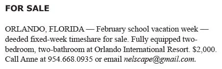 ORLANDO, FLORIDA — February school vacation week — deeded fixed-week timeshare for sale. Fully equipped two-bedroom, two-bathroom at Orlando International Resort. $2,000. Call Anne at 954.668.0935 or email [email protected].