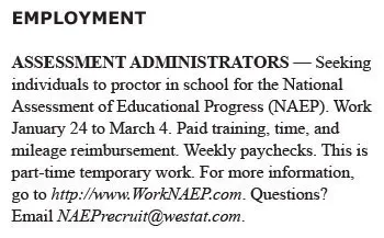 ASSESSMENT ADMINISTRATORS — Seeking individuals to proctor in school for the National Assessment of Educational Progress (NAEP). Work January 24 to March 4. Paid training, time, and mileage reimbursement. Weekly paychecks. This is part-time temporary work. For more information, go to http://www.WorkNAEP.com. Questions? Email [email protected].