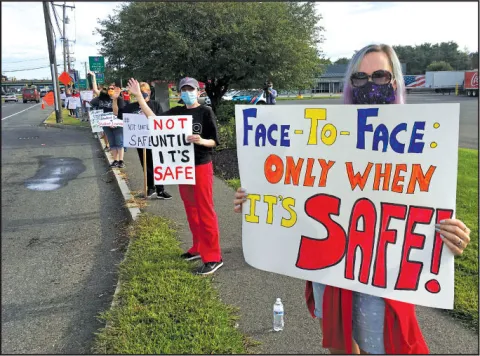 Dozens of educators took to the streets in Sharon during a protest on Sept. 14. Educators lined a long stretch of Route 5 in West Springfield on Aug. 19, a day of action to urge reopening schools #OnlyWhenItsSafe.