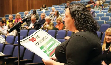 Melissa Verdier, president of the Educational Association of Worcester, speaks against the proposed charter school during the state’s public hearing on the application. Photo by Scott McLennan