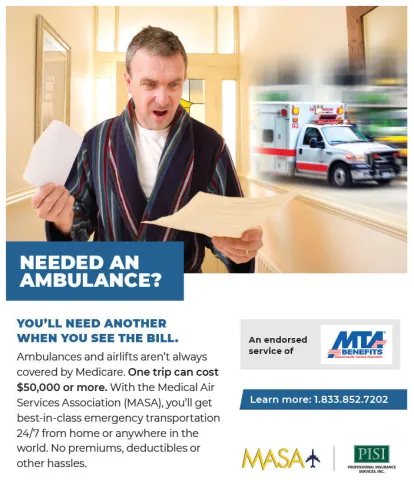Ambulances and airlifts aren’t always covered by Medicare. One trip can cost $50,000 or more. With the Medical Air Services Association (MASA), you’ll get best-in-class emergency transportation 24/7 from home or anywhere in the world. No premiums, deductibles or other hassles.