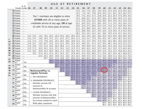 See the MTRS “Retirement Percentage” chart for tier 1 members, which shows a comparison of the percentage of salary average allowed under the regular and R+ formulas, by years of service and age at retirement. At 30 years of service,the R+ enhanced benefit is added for those who participate. As an example, someone who is enrolled in R+ and is 60 years old with 32 years of service if they retired would receive the maximum 80% for their pension while someone who is also 60 years old with 32 years of service but not enrolled in R+ would only receive 64%.