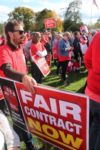 Members of the union, which has been without a contract for nearly two years, went on strike Friday after an overwhelming vote on Thursday afternoon to do so. The educators’ initial day of picketing was followed by a community rally that drew labor leaders and other supporters from throughout the state.