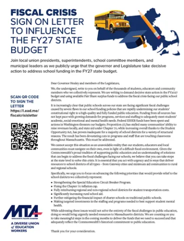 Ask your local union president, superintendent, school committee members and municipal leaders to sign on to a letter urging the governor and Legislature to take decisive action to address school funding in the upcoming state budget.